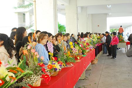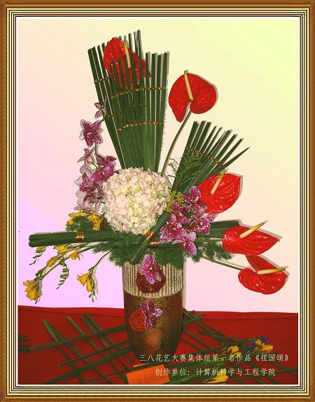 今年三八节的花艺比赛,是工会第三次举办,共有38个集体组和19个个人组参加,人数均超过往届。不少作品从构思、策划、设计、备料、现场制作以至作品命名,无不充分反映出作者独特的创意和匠心。作品成型示展,整个展场一派百花齐放、争妍斗丽的动人景象,令现场参观的领导、教工及众多学生啧啧称赞。经过评选,计算机科学与工程学院创作的作品《祖国颂》荣获集体组第一名;外语系的《五羊擎花颂祖国》、后勤总公司的《馨梦缘》、农业与园林学院的《花样年华》获第二名;机电工程学院的《书香雅韵》以及科研处、财务处、后勤总公司、教务处等五个部门的作品获第三名。生命科学学院刘容珍创作的作品《坚忍不拔》获个人组第一名;艺术设计系张雅、杨跃平的《绿旖》、生命科学学院陈晓玲的《腾飞》获第二名。