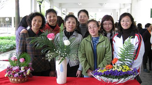 “ 三八”节期间,科研处、研究生处分会联合白云基建分会的女职工,组成欢乐姊妹班,喜气洋洋的参加学校工会组织的庆三八系列活动。在第三届教职工花艺大赛中,姐妹们集思广益、群策群力,精心创作了《月亮船》、《大小乔》、《心相印》三个作品。闪烁出她们的智慧之光,更体现出她们热爱生活、乐观向上的精神风貌。“月亮船”传递了她们的心声——“月亮船呀月亮船,载着我们的小小心愿,祝愿姐妹同胞快乐欢欣,祝愿家园如花似锦阳光灿烂”;“大小乔”简洁素雅——以三国人物喻花之清雅娇美;“心相印”表达了她们对伴侣、家庭、同仁、事业的美好祈愿。
