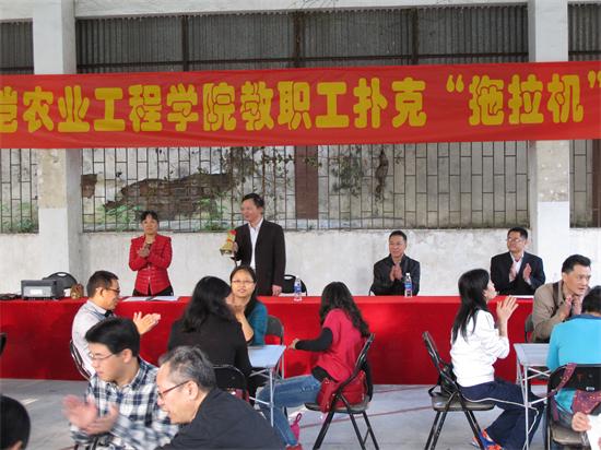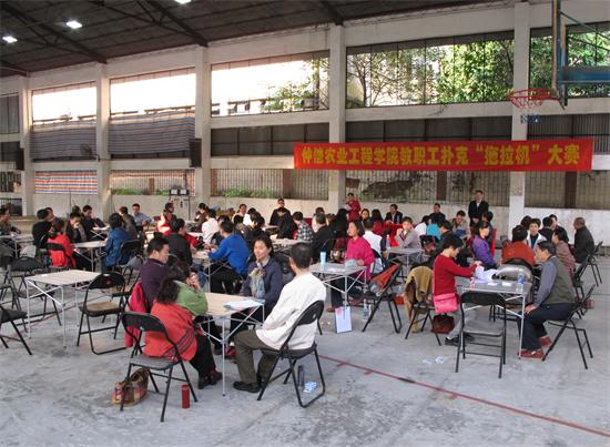 我校教职工第三届扑克牌“拖拉机”大赛于11月15日在海珠校区风雨球场举行。参加本届比赛的有16个部门工会牌艺代表队共64位选手。