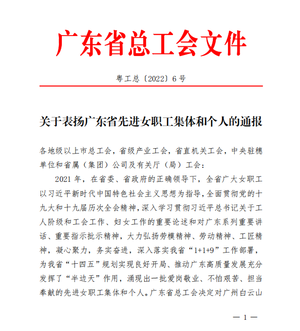 近日,为大力弘扬劳模精神、劳动精神和工匠精神,激励全省广大女职工奋进新征程、建功新时代,广东省总工会发布《关于表扬广东省先进女职工集体和个人的通报》(粤工总〔2022〕6号),对全省60个先进集体和100名先进个人予以通报表扬。其中,我校轻工食品学院包装工程系系主任、党支部书记肖乃玉获评“广东省先进女职工”荣誉称号。