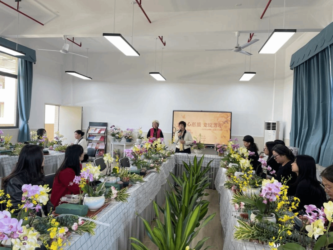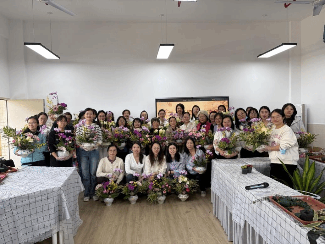 本次活动邀请广州市职业技能鉴定培训中心花卉花艺指导老师、现代插花创始人周惠贞担任主讲老师。活动现场,周老师首先从兰花的品种特性、生长习性讲起,详细介绍了盆栽搭配、养护技巧及艺术造型等知识。在周老师的悉心指导下,大家纷纷动手实践,挑选心仪的兰株、搭配雅致的花盆、铺陈营养植料、调整植株姿态……现场气氛温馨而热烈,充满了欢声笑语。女教职工们沉浸于创作的专注与愉悦之中,巧手翻飞间,一盆盆独具匠心、清雅脱俗的兰花盆景在指尖诞生,不仅展现了自然之美,更融入了个人的巧思与情感。
