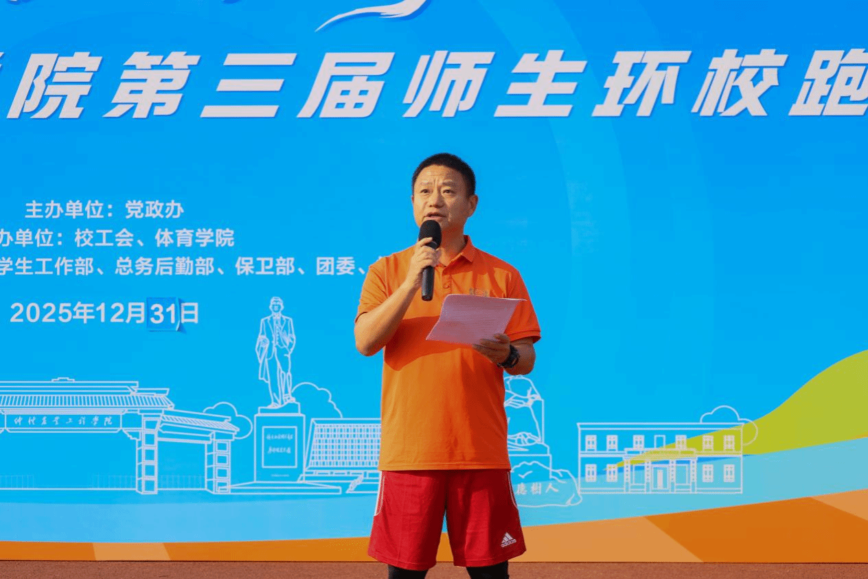 开幕式上,廖明代表学校向参与活动的师生及幕后工作人员致以衷心感谢与诚挚问候,他深情回顾了2025年学校发展取得的累累硕果:这一年,学校圆满完成本科教育教学审核评估工作,办学质量与水平迈上新台阶;霍英东文化体育中心顺利落成并揭牌,为校园增添了新的活力;三全育人综合改革持续深化,五育并举工作扎实推进,学科建设与科学研究均取得丰硕成果,不仅实现了“十四五”规划的圆满收官,更为“十五五”规划的启动奠定了良好基础。廖明指出,新年环校跑不仅是特色体育活动,更是凝聚师生奋进力量的纽带,希望大家以实际行动积极参与校园体育文化建设,以此次环校跑为新的起点,继续保持一往无前的奋斗姿态,发扬锐意进取的创新精神,锚定目标,笃行不怠,共同为将学校建设成为特色鲜明的高水平应用型大学做出更大的贡献。