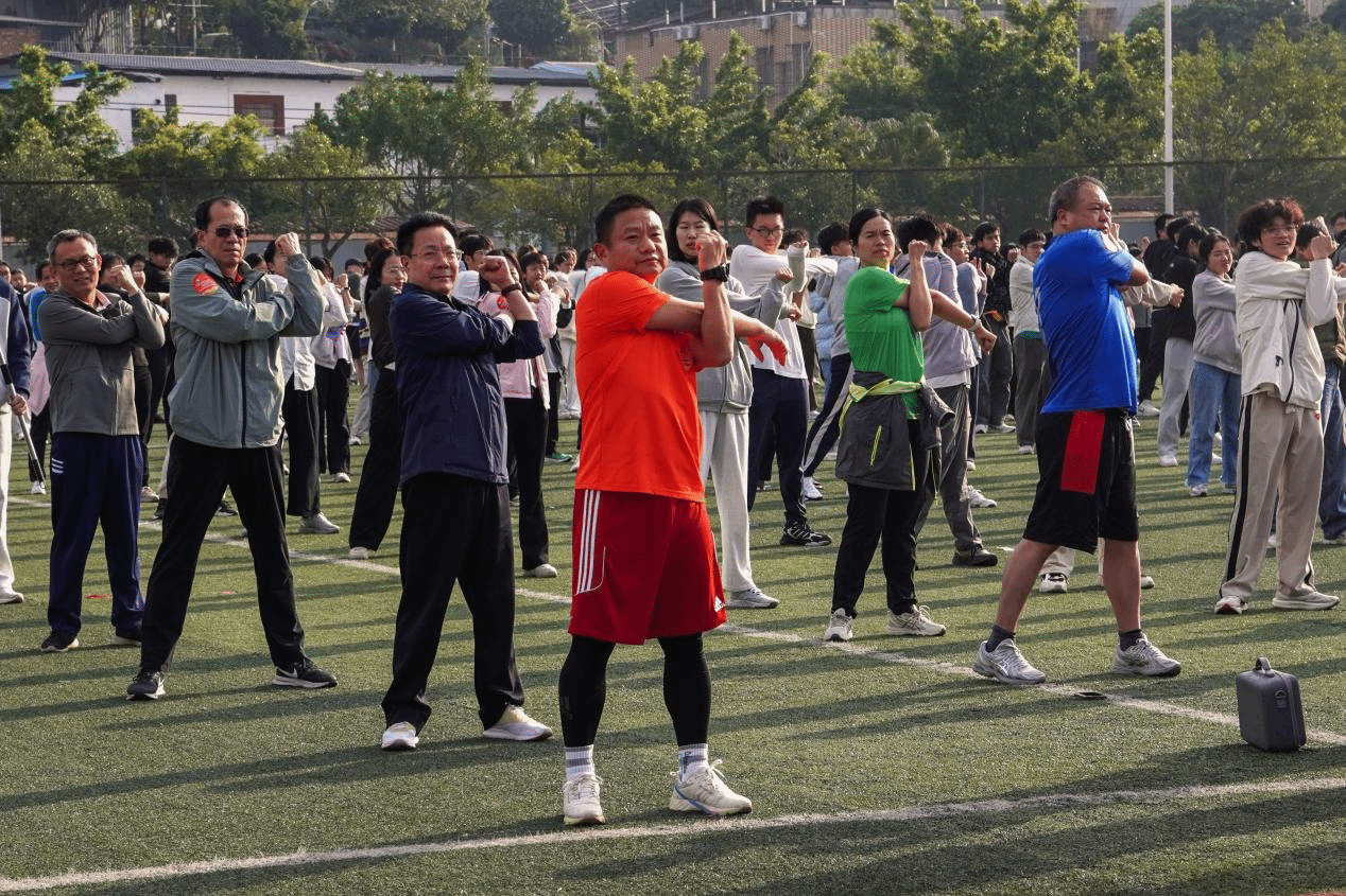 为保障活动安全有序开展,正式开跑前,体育学院老师带领校健美操队队员,为全体师生开展了科学细致的热身指导。随着“两手侧平举、左右散开、头部运动加手臂运动”等清晰指令,师生们充分舒展身体,为即将到来的奔跑做好准备。