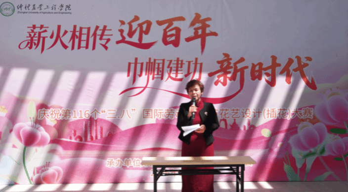 陈晓玲为本次活动致辞。她首先向全校女教职工致辞以节日的祝福,感谢大家在推动学校高质量发展新征程上付出的努力和贡献。她指出今年是“十五五”开局之年,明年是学校百年华诞,这次活动以“薪火相传迎百年 巾帼建功新时代”为主题,目的是希望用花艺创作的方式,将仲恺精神的百年传承与巾帼风采的绽放融入一花一叶艺术设计作品中,希望各参赛队伍充分发挥才智,创作出精美作品献礼百年校庆,并预祝本次大赛取得圆满成功。